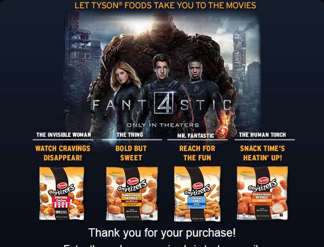 Now you have to have delicious food for a movie marathon so I have put together an amazing Tyson® Any’Tizers® spread for our Fantastic Four movie marathon! I even whipped up Invisible Woman Kabobs and Human Torch Sliders but enough about that let me tell you how you can get a ticket to see FANTASTIC FOUR. This simple 3 step process will get you a code to redeem a movie ticket in no amount of time at all, and you will have some delicious Tyson® Any’Tizers® to munch on!